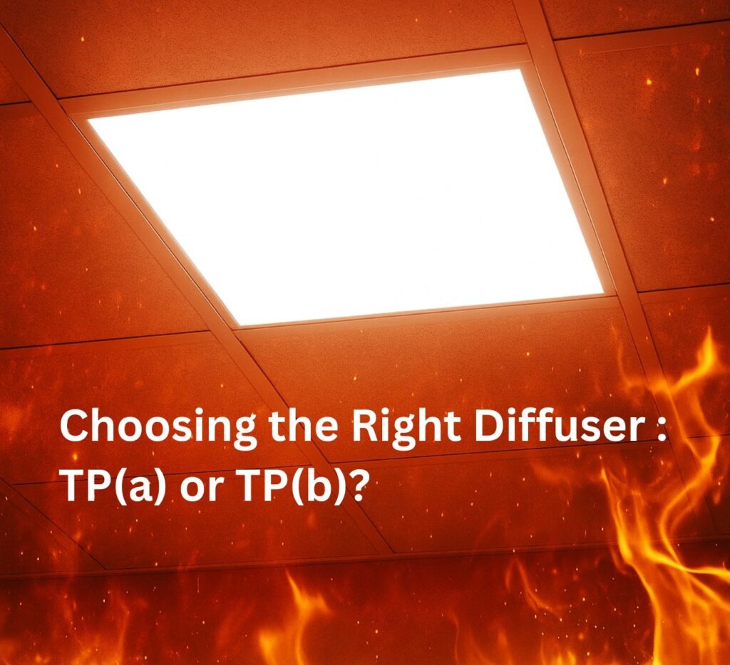 In the UK Building Regulations (Approved Document B: Fire Safety), TP(a) and TP(b) are official classifications that describe the fire performance of thermoplastic lighting diffusers. These diffusers — commonly used in LED panels and downlights — are tested to determine how they react to heat and flames, helping ensure safety in commercial and residential lighting installations.