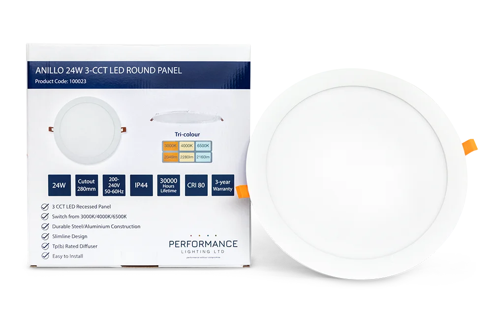 The Anillo series is a versatile range of slimline, high-efficiency 3-CCT LED recessed panels, designed for reliable performance across a variety of commercial settings — including offices, retail, and hospitality environments.