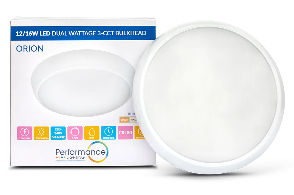 Orion is our wattage & colour switchable 3-CCT 12 & 16W LED bulkhead fitting. Featuring a built-in emergency inverter and battery pack, it provides up to 3 hours of backup lighting during power outages. The Microwave Motion Sensor with corridor function enhances efficiency by activating lights sequentially when movement is detected, minimizing energy use in standby mode.